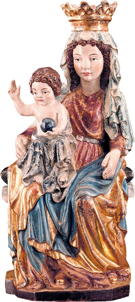 Auf Kreidegrund mit Temperafarben bemalt, antikisiert und auf Poliment mit 23 Karat Blattgold veredelt.